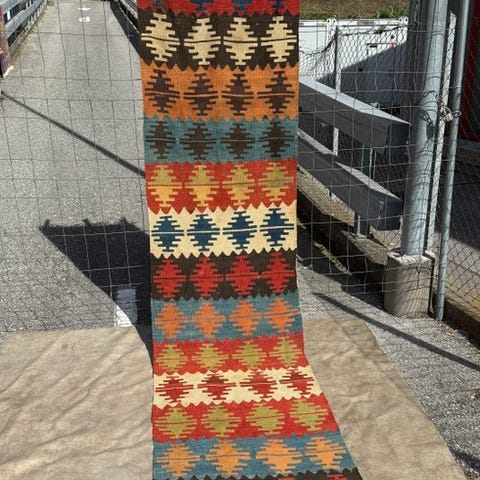 Smukke kelim i varme farver fra Taurus-bjergene ved Fethiye. Alder 70 år. I de to centrale felter er symbolet for familiebånd og ønske om langvarigt samvær afbildet. I de seks omgivelser er en ulveskalle vist, symbol på beskyttelse. Til venstre og højre herfor er ramshorn, et tegn på mandlig styrke og beskyttelse, afbildet i de hvide kanter. Symbolet i den ydre kant kaldes elibelinde (hånd i hoften), et symbol på moderlighed og frugtbarhed. Robust kelim af høj vævekvalitet.