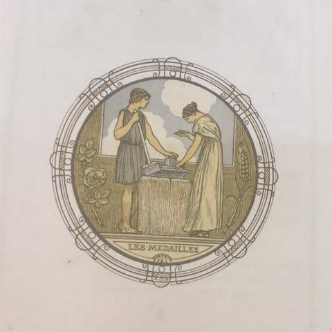 På et frit blad (25,5 x 20,5 cm) er der en original humoristisk tegning udført med blæk, farvet med farver, håndsigneret af Willette og ledsaget af følgende note: 'Marie-Thérèse i forlystelsesparken // Ah fadder, hvis jeg faldt over