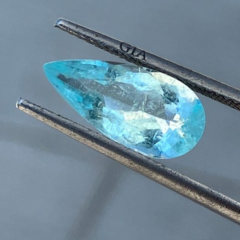 Naturlig Paraiba-tourmalin, 1 sten, 7,37 karat, pudeform, facetskoeret, gennemsigtig med let inklusion, oprindelse Mozambique. Klik på den blå "gå til varen" knap, for at købe eller byde på denne vare. Den samlede pris vil blive vist inden du afgiver dit bud.