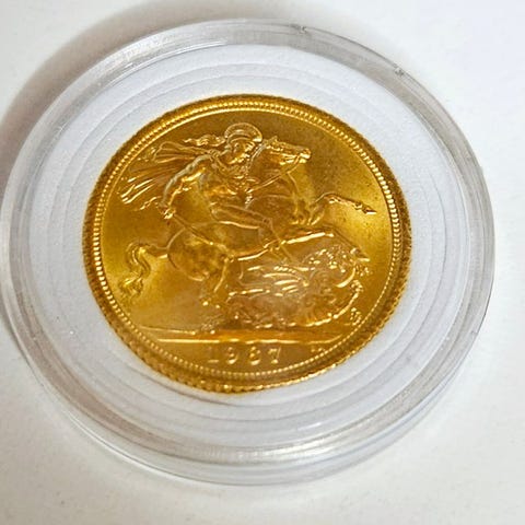 Guld-souverän fra Storbritannien fra 1967 med dronning Elizabeth II, vægt 7,98 g guld, ikke graderet, fra verdensmønter (før 2000, ikke euro). Klik på den blå "gå til varen" knap, for at købe eller byde på denne vare. Den samlede pris vil blive vist inden du afgiver dit bud.