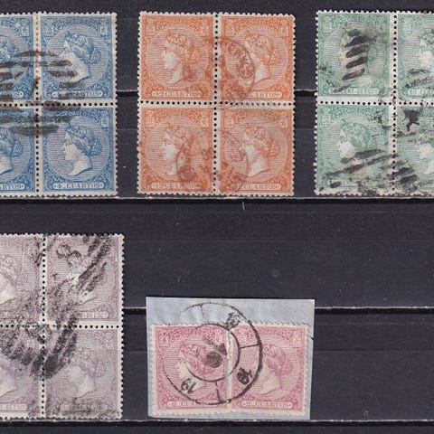 6 reales, blå. Brugt. En smule stramt men komplet. Sjælden.