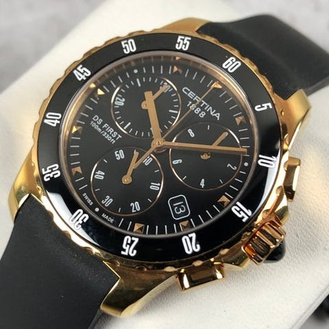Certina DS First Chronograph Lady Ceramic, reference C014.217.37.051.00, quartz-ur med 2020+ med en 35 mm kasse af stål, keramisk og forgyldt, sort skærm med safirglas, original sort gummistrap, inklusive original æske og papirer. Klik på den blå "gå til varen" knap, for at købe eller byde på denne vare. Den samlede pris vil blive vist inden du afgiver dit bud.