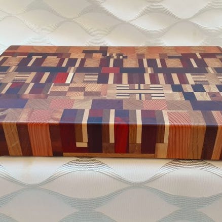 Køkkenskærebræt, håndlavet i massivt træ, sammensat af otte ædle træsorter: mahogni, eg, ipe, purpleharth, lærke, palme, iroko.