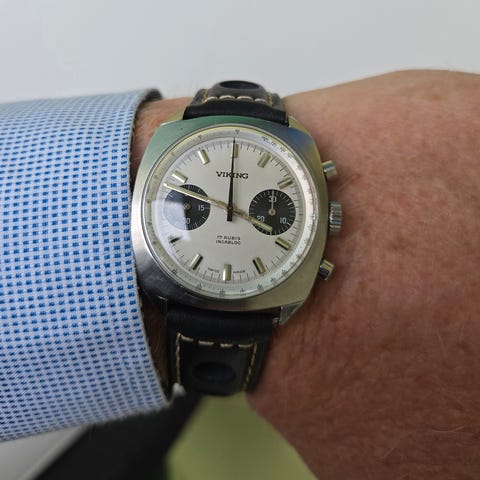 Gallet kronograf fra 1950'erne med håndoptræk Venus 175 værk, stålstål urkasse med knopformet kant på 37 mm, hvid skive, læderrem på 18 cm, meget god stand med få brugssynlige spor, fungerer fuldt ud inklusive kronograf, senest service 2022; original æske og papirer medfølger ikke. Klik på den blå "gå til varen" knap, for at købe eller byde på denne vare. Den samlede pris vil blive vist inden du afgiver dit bud.