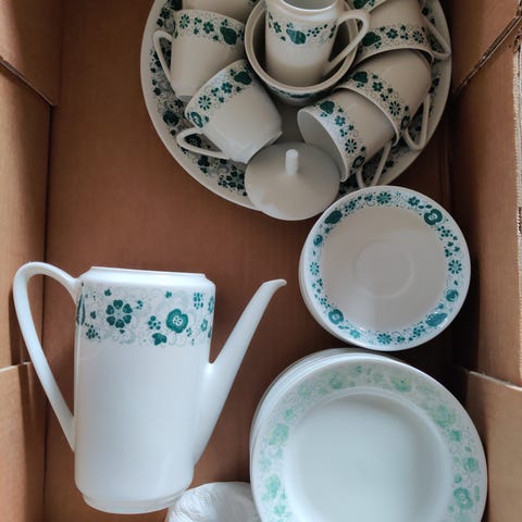 Indhold: 6 tallerkener, 4 underkopper, 5 kopper