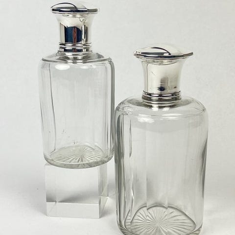 Kroppen er lavet af klart, luksuriøst krystal med elegant indgraverede dekorationer af vinranker og blade, typisk for overgangen mellem Art Nouveau og Art Deco.