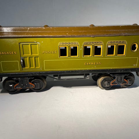 Andet, Bing Bliktog, Samling Bing / Gebrüder Bing tysk kvalitets blik tog fra cirka 1930 erne, bestående af 1 lokomotiv med kulvogn, 2 passagervogne, 1 godsvogn, 1 kranvogn og en tankvogn, samt 12 lige skinner, 8 buede, 1 skiftespor, 1 krydsspor og 1 signalting. Rimelig stand i forhold til alder