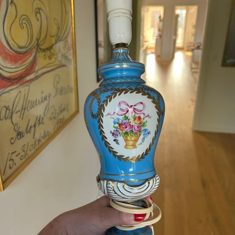 Lampen er rig på plastiske blomsterapplikationer og er udsmykket med guldfarvede dekorative elementer.
