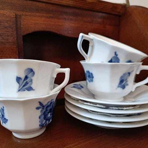 Porcelæn, Mokkakopper/ kage tallerkener, Royal copenhagen., 10 Blå kant Mokka kopper ( espresso kaffe) med underkopper fra 60'erne, Royal Copenhagen. Fajance. Alle i fin stand uden skår eller nævneværdigt slid. 10 kage tallerkener i rimelig fin stand. Kontakt gerne pr. sms på 42 25 61 10 til Lene. Pr. sæt 35 kr. Alle 10 sæt samlet. Pris