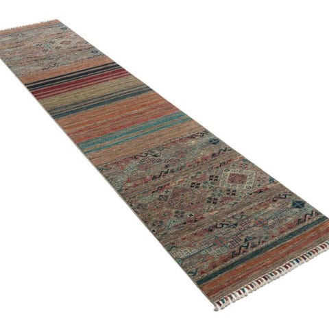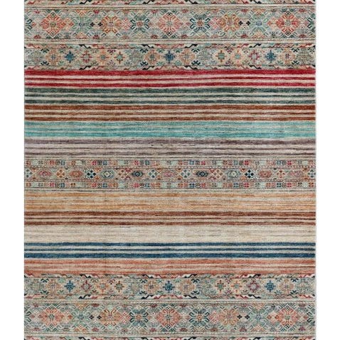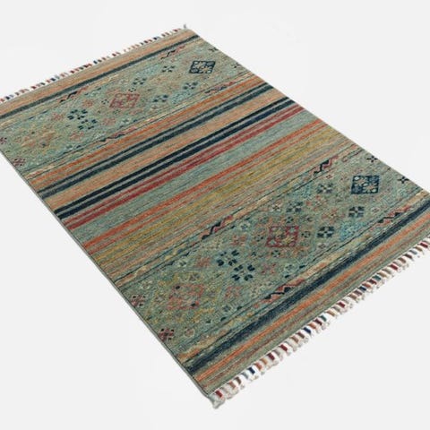 Smukt håndknyttet designer-tæppe fra Pakistan med traditionelt Samarkand-motiv. Den harmoniske kombination af geometriske mønstre og varme farvetoner gør dette stykke til et særligt højdepunkt i ethvert hjem.