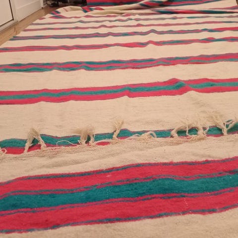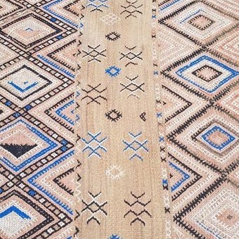 Historisk vigtighed: De berbiske tæpper er håndvævet af kvinder fra de berbiske stammer i Marokko. De er et spejl af den berbiske kultur og traditioner, hvor hvert tæppe fortæller en historie eller repræsenterer tro og aspirationer hos sin skaber.