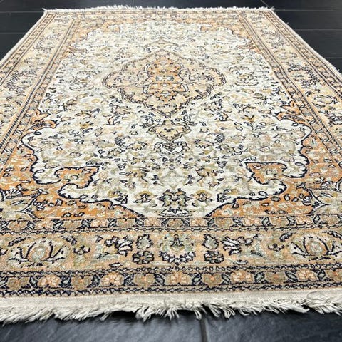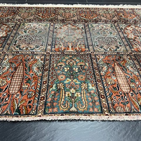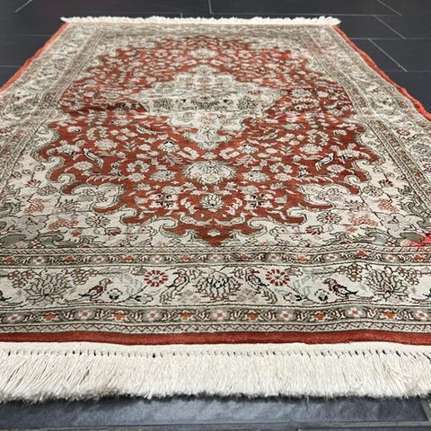 Håndknyttet Kaschmir-silke tæppe fra Pakistan, Kashmir-regionen, uld på silke, 120 x 180 cm, i god stand med alders- og brugsspor. Klik på den blå "gå til varen" knap, for at købe eller byde på denne vare. Den samlede pris vil blive vist inden du afgiver dit bud.