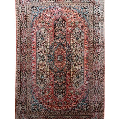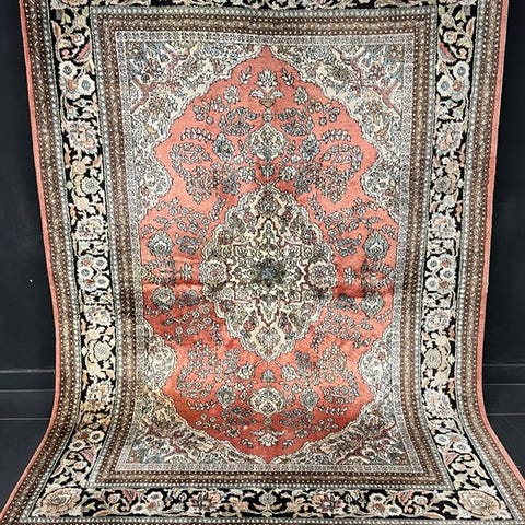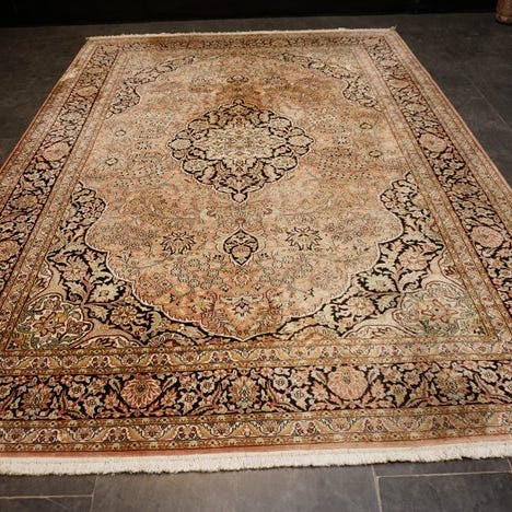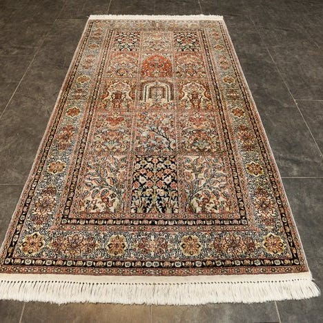 Der tilbydes et håndknyttet kasmir-silke orientalsk tæppe.