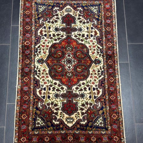 For at komme ind i vores lager, er det blevet renset på et vaskeri, der er specialiseret i håndknyttede tæpper, og er derefter ikke længere brugt.