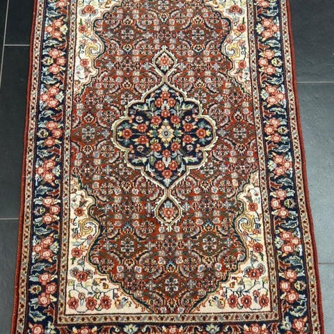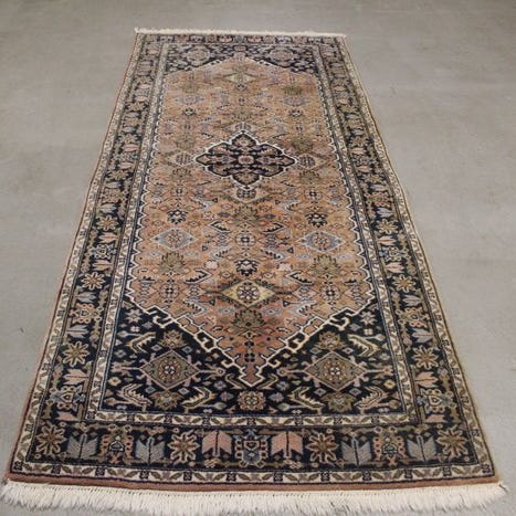 Dette er et håndknyttet østligt tæppe lavet af bæredygtige, naturlige materialer. Måden at knytte det på og mangfoldigheden i mønstrene gør dette tæppe unikt og understreger det autentiske og håndværksmæssige karakter.