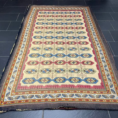Det er et rundt tæppe med stor dekorativ tilstedeværelse, med en blød og ensartet tekstur. Bevaringsstanden er fremragende, næsten som nyt, meget lidt brugt og perfekt vedligeholdt, hvilket er sjældent for genstande fra denne