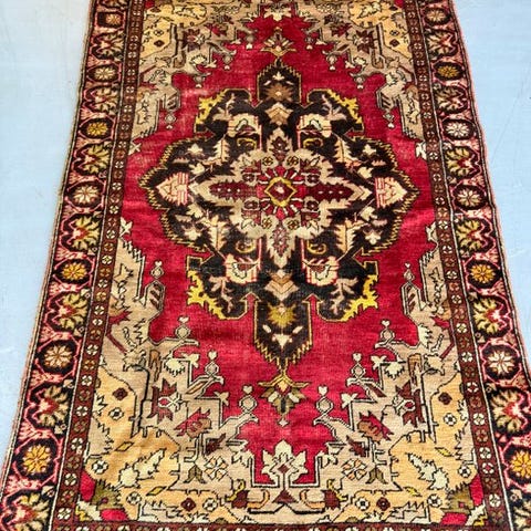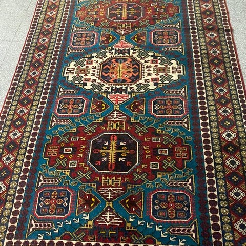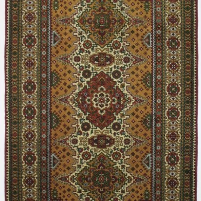 Håndknyttet orientalsk uldtæppe, dekoreret med tre centrale medaljonger og tre kanter. Tæppet er dateret 1970.