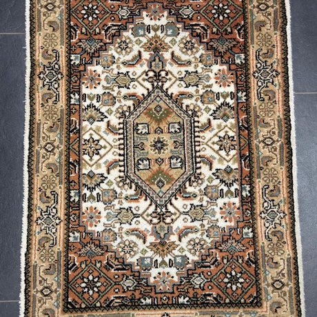 Oprindelse: Indien; håndvævet Bidjar perserteppe, 154 x 94 cm, uld på bomuldsgarn, professionelt rengjort. Klik på den blå "gå til varen" knap, for at købe eller byde på denne vare. Den samlede pris vil blive vist inden du afgiver dit bud.