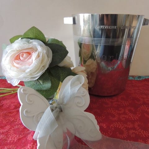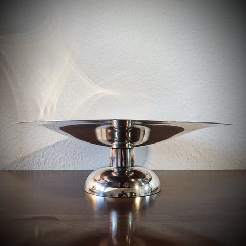 Artiklen er i fremragende stand med nogle få mindre ridser, let slitage på undersiden og tre små aftryk. Samlet set er den stadig skinnende, solid og bevarer sin elegance og funktionalitet.