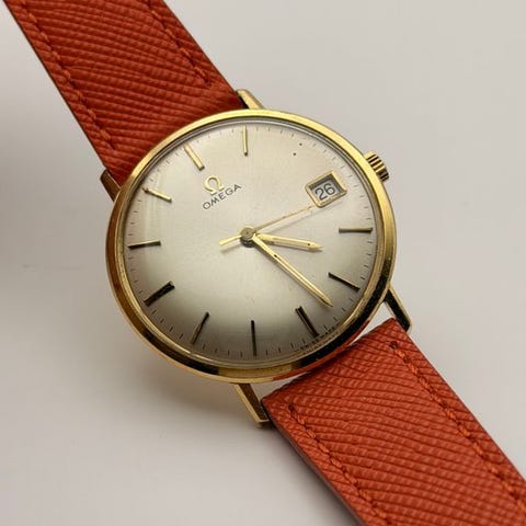 Omega Bumper Automatic reference 2709, cirka 1952, kasse i 14K guld (0,585), diameter 34 mm, automatisk bevægelse, hvid skive med påførte gyldne tal og løbende sekund, brun læderrem (eftermontering), god stand med mindre ridser/slidmærker. Klik på den blå "gå til varen" knap, for at købe eller byde på denne vare. Den samlede pris vil blive vist inden du afgiver dit bud.