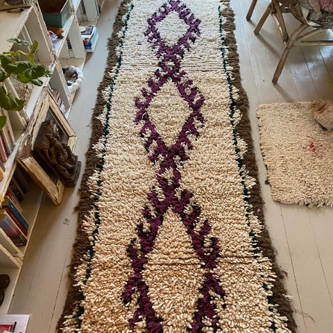 Dit unikke marokkanske løber er håndvævet af traditionelle håndværkere og bærer en frisk, fornyende energi – en følelse af lethed, fornyelse og ungdommelig vitalitet. Kombinationen af naturlig uld, vævet på katoendraad, gør løberen lettere og mere fleksibel end de tungere, fulduldne varianter, samtidig med at den bevarer sin varme, blødhed og kvalitet.