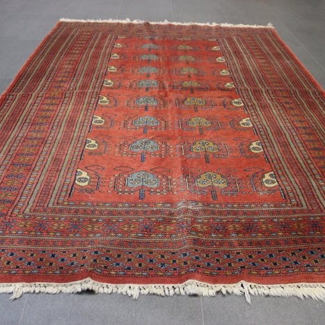 Et håndvævet Buhara tæppe, model Doppelknüpfung Buhara fein, oprindelse Pakistan, mål 380 cm x 280 cm. Klik på den blå "gå til varen" knap, for at købe eller byde på denne vare. Den samlede pris vil blive vist inden du afgiver dit bud.