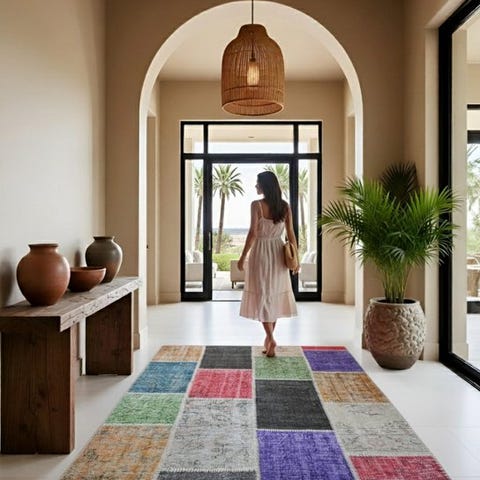 Smukt håndknyttet tæppe af uld og bomuld, naturligt farvet uden kemikalier. Hovedfarverne er creme, rød, sort og grøn. Tæppet er med smuk, professionel og stram knytning og har korte frynser.