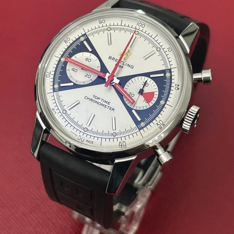 Breitling Top Time B01 Deus, reference AB01765A1B1X1, 42 mm stålurkasse med sort urskive og safirglas, automatisk schweizisk kaliber B01, læderrem, mint tilstand som eks-display, med original boks, papirer og Breitling fabriksgaranti. Klik på den blå "gå til varen" knap, for at købe eller byde på denne vare. Den samlede pris vil blive vist inden du afgiver dit bud.