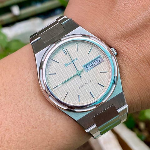 Den 10-karats fyldte guldkasse med en diameter på 35 mm, bunden er i rustfrit stål og signeret.