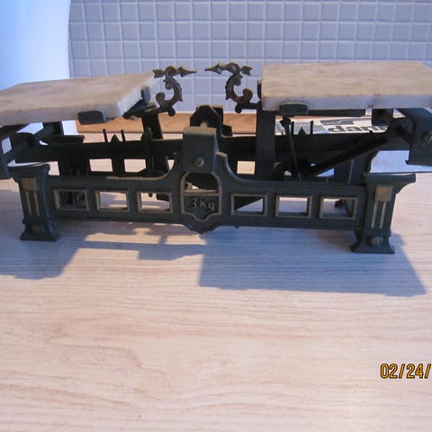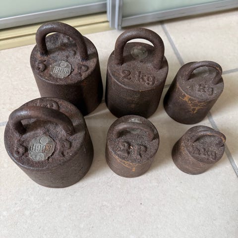 Antik køkkenvægt og lodder., Smedejernsvægt og 6 messinglodder., De 6 messinglodder er med stempler og fra 1861 og til 1908.