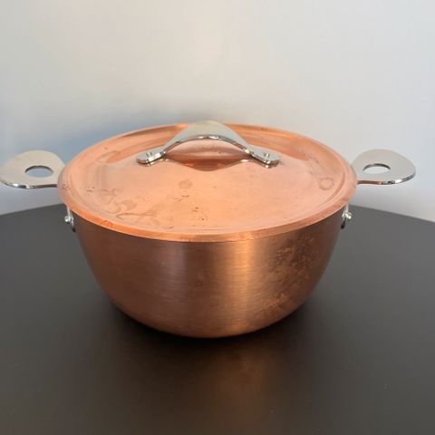 To professionelle kogepander fra det belgiske mærke Wegro, udført i tykt kobber (1,5 til 2 mm) med indvendig side i rustfrit stål og robuste messinghåndtag. Denne kombination giver fremragende varmeledningsevne og en robust, holdbar kvalitet, der er elsket af kokke og entusiaster.