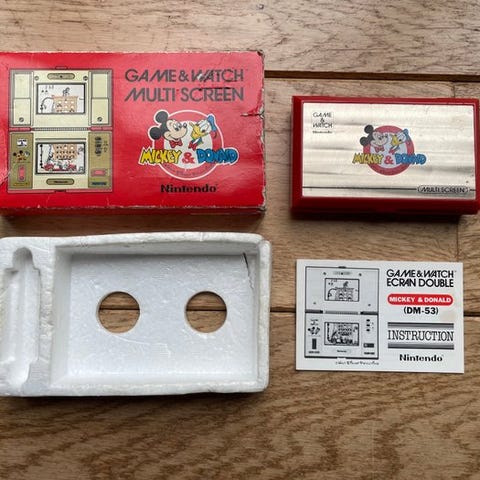 Nintendo Game & Watch Multiscreen‑serie med Donkey Kong II, Mario Bros. og Mickey & Donald fra 1983 i ufuldstændig tilstand, alle tre testet funktionelle, uden original emballage. Klik på den blå "gå til varen" knap, for at købe eller byde på denne vare. Den samlede pris vil blive vist inden du afgiver dit bud.