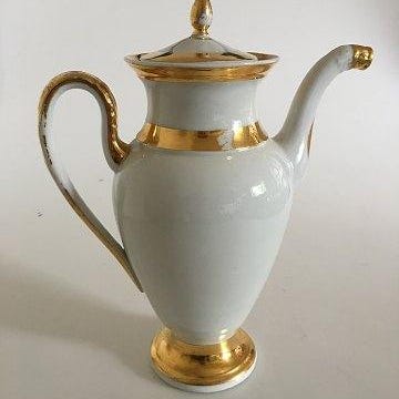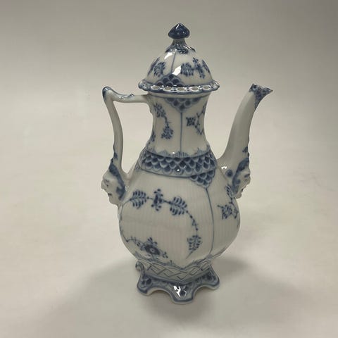 Royal Copenhagen Halvblonde Kaffekande, flødekande og sukkerskål med metal montering Måler: Kaffekande 23,5cm / 9.25 inch Flødekande 15cm / 5.91 inch Sukkerskål 18,5cm / 7.28 inch