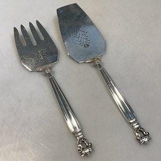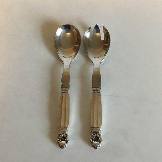 Georg Jensen Konge Sterling Sølv Salat Sæt. Måler 23,8cm og er i god stand. Designet i 1915 af Johan Rohde (1856 - 1935). Johan Rohde var grafiker, maler, arkitekt, designer og kritiker. I 1880’erne, var Rohde en vigtig kunstner i Tyskland og Danmark. Han udfordrede de traditionelle måder at undervise på Det Kongelige Danske Kunstakademi og var førende i tilblivelsen af Den Frie Udstilling, som havde til formål at vise værker af kunstnere, hvis arbejde ikke blev accepteret. Han designede genstande til hverdagen - møbler, sølvtøj og korpus til hans eget hjem. Rohde og Georg Jensen mødte hinanden første gang, da Rohde bestilte Jensen til at udføre et af hans korpusdesigns. Da dette var vellykket, besluttede de at fortsætte samarbejdet. De arbejdede sammen i mange år efter.