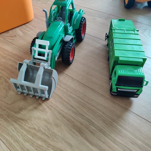 Skraldebil legetøj i grøn farve med blå skraldespand.