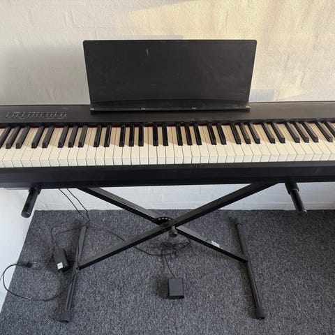 Roland RP-107 Digitalpiano med 88 tangenter, sort finish og tre pedaler. Inkluderer musikstand og manual. Velegnet til hjemmebrug og musikundervisning. Købt april 2024