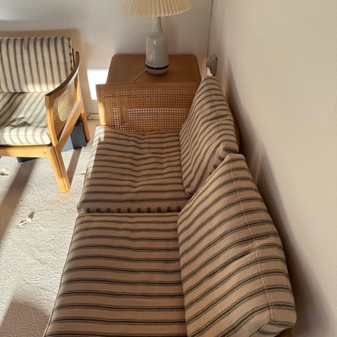 Illum Wikkelsø plexus sofa i egetræ. Har brugsspor, og bunden på den ene side af sofaen skal skiftes. Det er et nemt DIY projekt der kun kræver en hæftepistol og noget tykt møbelstof. Der medfølger ikke hynder. Se billeder for stand.