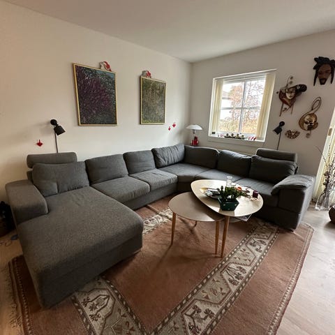 Grå hjørnesofa med venstrevendt chaiselong sælges. Fin stand, stabil og komfortabel. Bemærk: Stoffet/duggen under sofaen er faldet lidt ned (se på billedet). Det er kosmetisk og man kan ikke se det på afstand. Puderne på billederne kan følge med, hvis du ønsker det.