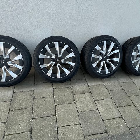 Sælger originale Tesla Model 3 fælge monteret med Michelin sommerdæk i flot stand.