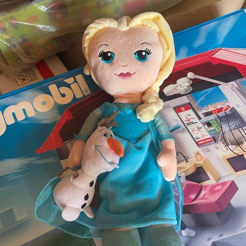 Disney Elsa bamse med lyseblåt kjole og lyseblondt hår. Bamsen forestiller karakteren Elsa fra Disney. Den er ca. 20 cm. Brugt meget lidt og er i rigtig flot stand.