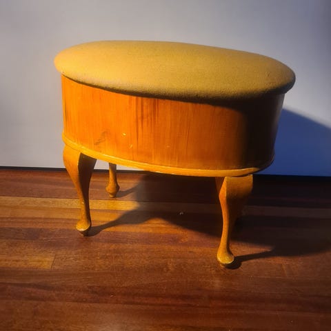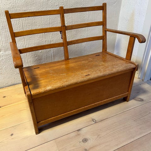 Træbænk med opbevaringsrum under sædet. Bænken er malet hvid og viser tegn på slid og patina, hvilket giver den et rustikt udseende. Egnet til opbevaring og siddeplads i hjemmet.