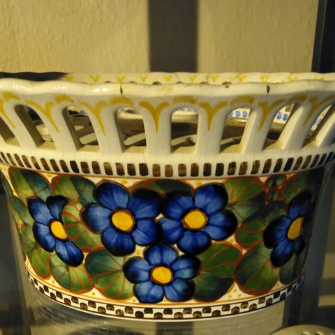Aluminia oval jadinere med blomster og reparation se billeder pris 600 kr kan sendes forsvarligt svare kun på sms eller ring på tlf nr 60661540 se også mine andre annoncer og ved køb af mere finder vi en god pris