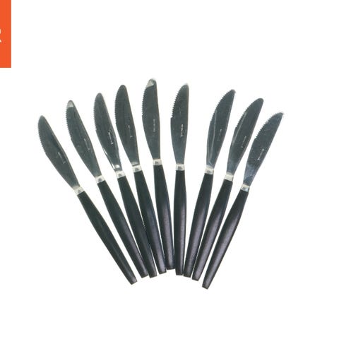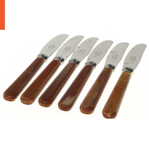 Dette smørknivsæt består af seks smørknive, hver med en længde på 21,5 cm. Knivene har en robust konstruktion med plastikhåndtag i en brunlig farve. Bladene er lavet af metal, hvilket giver en god skæreevne. Sættet kommer i en flot gaveæske, der gør det ideelt til gavegivning eller elegant opbevaring.
