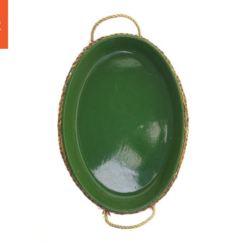 Denne dekoration er en rund bakke med en diameter på 34 cm, udsmykket med intrikate mønstre, der inkluderer blomstermotiver og kunstfærdige linjer. Bakken har en krum, ornamenteret kant og et antikt udseende med forsætligt aldersrelateret patina, som tilføjer til dens charme. Bagsiden af bakken er ensfarvet uden mønster.