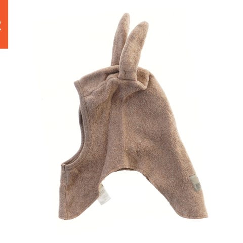En brun uld elefanthue designet til babyer. Huen har en række labels, den ene med logoet huttelihut. Huen har en klassisk form der dækker både hoved og nakke, med udvidede områder til at dække ørerne. Den er lavet i et blødt materiale, der sikrer varme og komfort. Den har en længde fra top til bund på 38 cm.