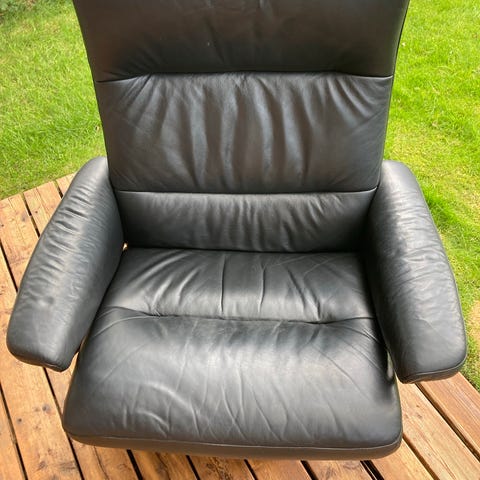 2 dejlige stressless lænestole fra Ekornes i sort læder, der kan dreje 360 grader og justeres alt efter ens behag. Sælges med tilhørende skammel.