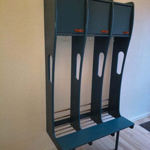 Pæn garderobe til 4 børn med skab og hylde foroven og plads til sko I bunden