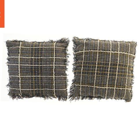 To kvadratiske puder med et plaid-design, der måler hver 45x46 cm. Puderne har et mønster i gule og blå nuancer på den ene side, mens den anden side er ensfarvet mørkeblå. Puderne har frynser langs kanterne, der tilføjer en rustik charme.
