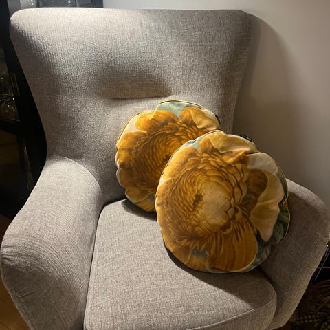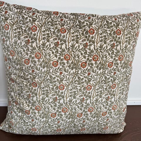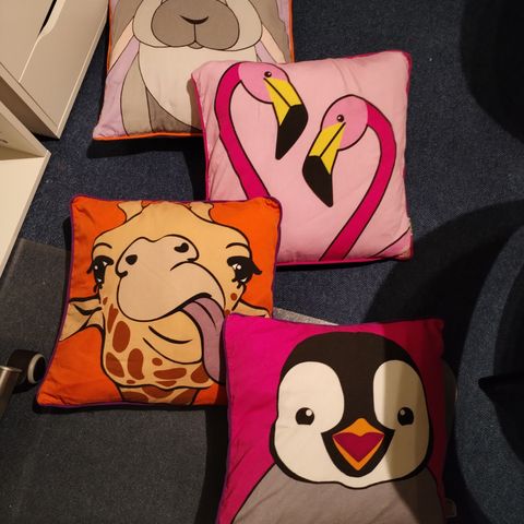 To kvadratiske puder med leopardmønster. De måler 49x48 cm. Forsiden har et livligt leopardprint mens bagsiden er ensfarvet beige. Der er en diskret lynlås på kanten, så betrækket kan tages af. Puderne præsenterer et unikt design med billeder af hunde i den centrale del af leopardmønsteret. Dette kan tilføre et kreativt og eksotisk præg til en sofa eller stol.