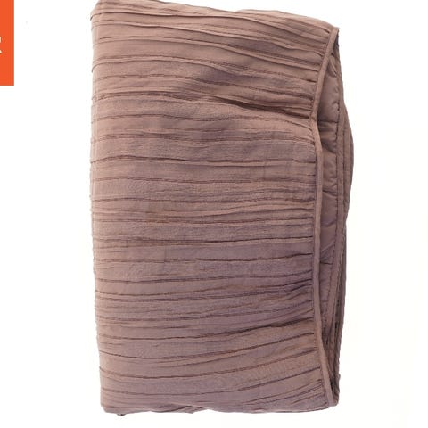 Dette billede viser et sammenfoldet tæppe med et diskret geometrisk mønster. Tæppet har en ensartet lysebrun farve og er fremstillet af et blødt materiale, der ser behageligt ud. Det er i størrelsen 384x248 cm, hvilket gør det stort nok til at dække en betydelig del af gulvet i en stue eller et soveværelse.